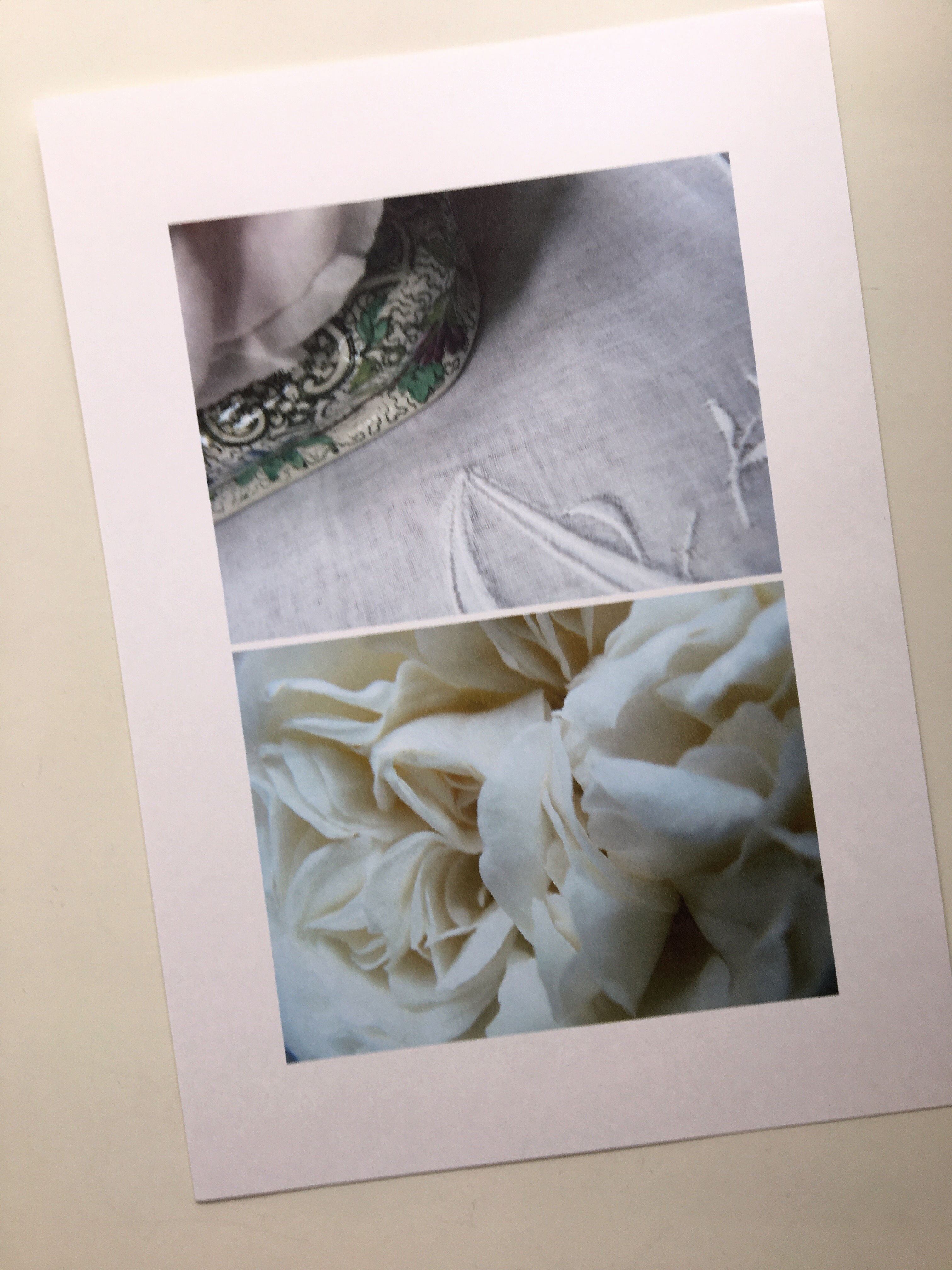 自身で撮影したバラのポスター。花びらをアンティークの器に飾ったものと白い花びらの美しいバラを。